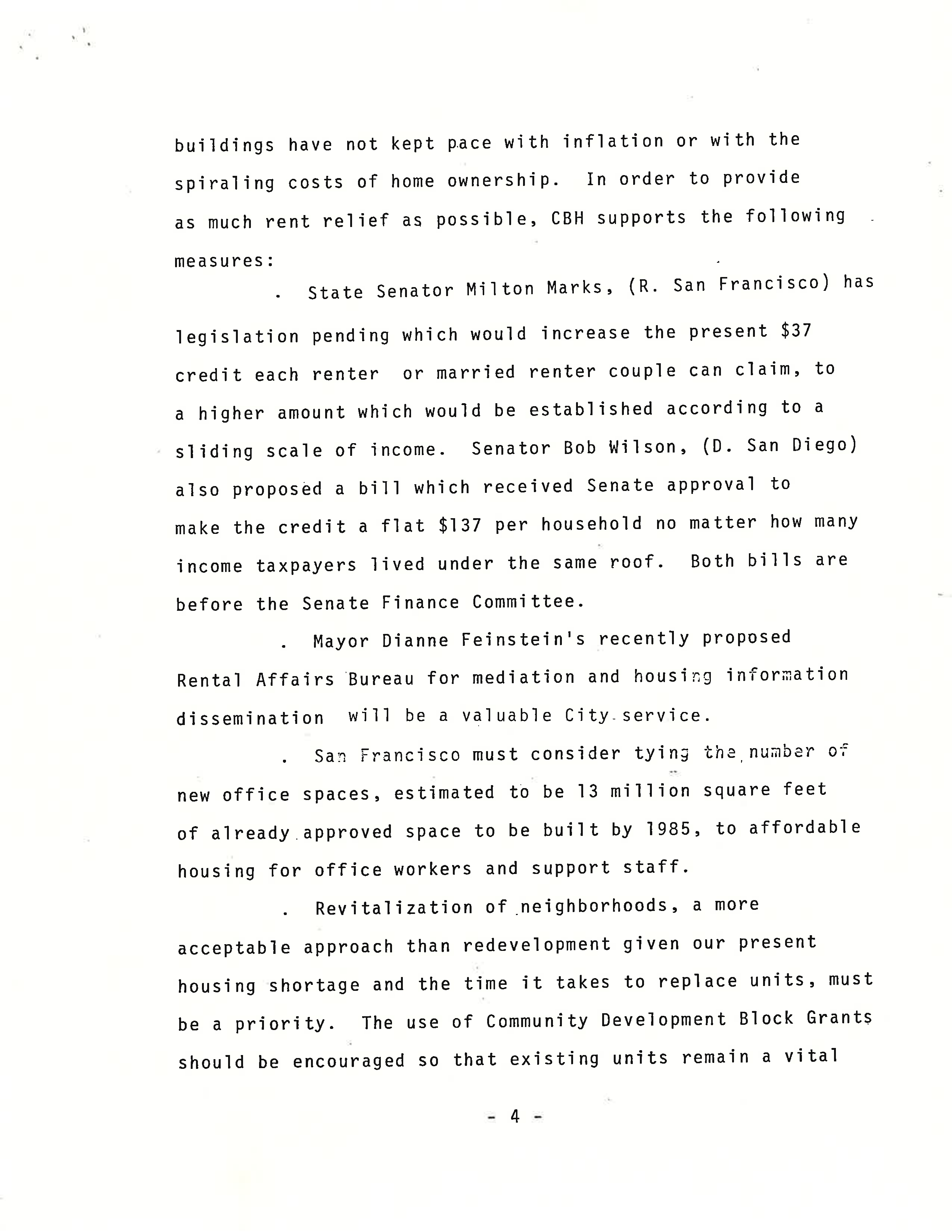 Nearly 70 percent of San Francisco's residents are renters, which is double the national average. Of the 315,000 dwelling units in the City, two-thirds of the units are rentals; one-third are owner occupied. Rents in most San Francisco buildings have not kept pace with inflation or with the spiraling costs of home ownership. In order to provide as much rent relief as possible, CBH supports the following measures: