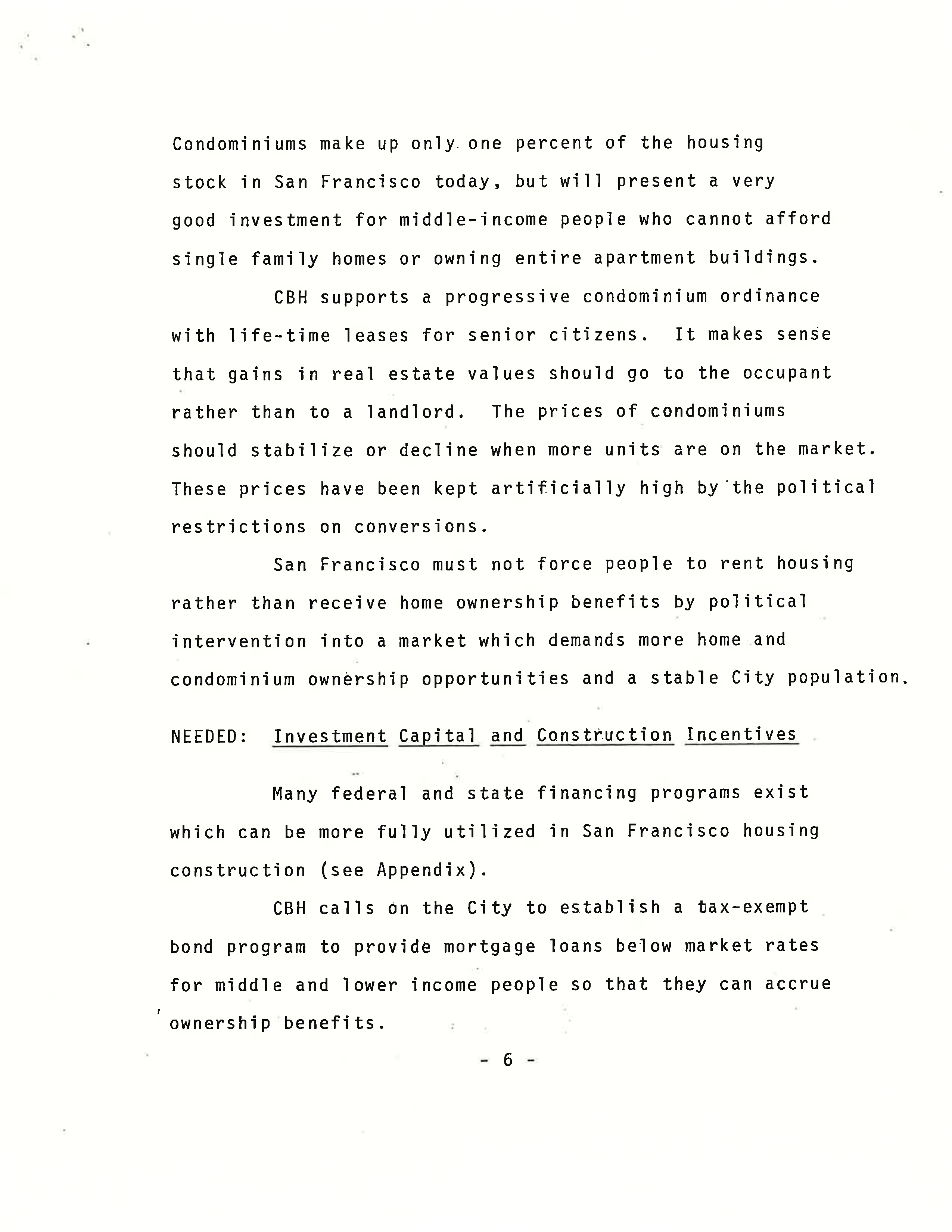 CBH supports a progressive condominium ordinance with life-time leases for senior citizens. It makes sense that gains in real estate values should go to the occupant rather than to a landlord. The prices of condominiums should stabilize or decline when more units are on the market. These prices have been kept artificially high by the political restrictions on conversions.
