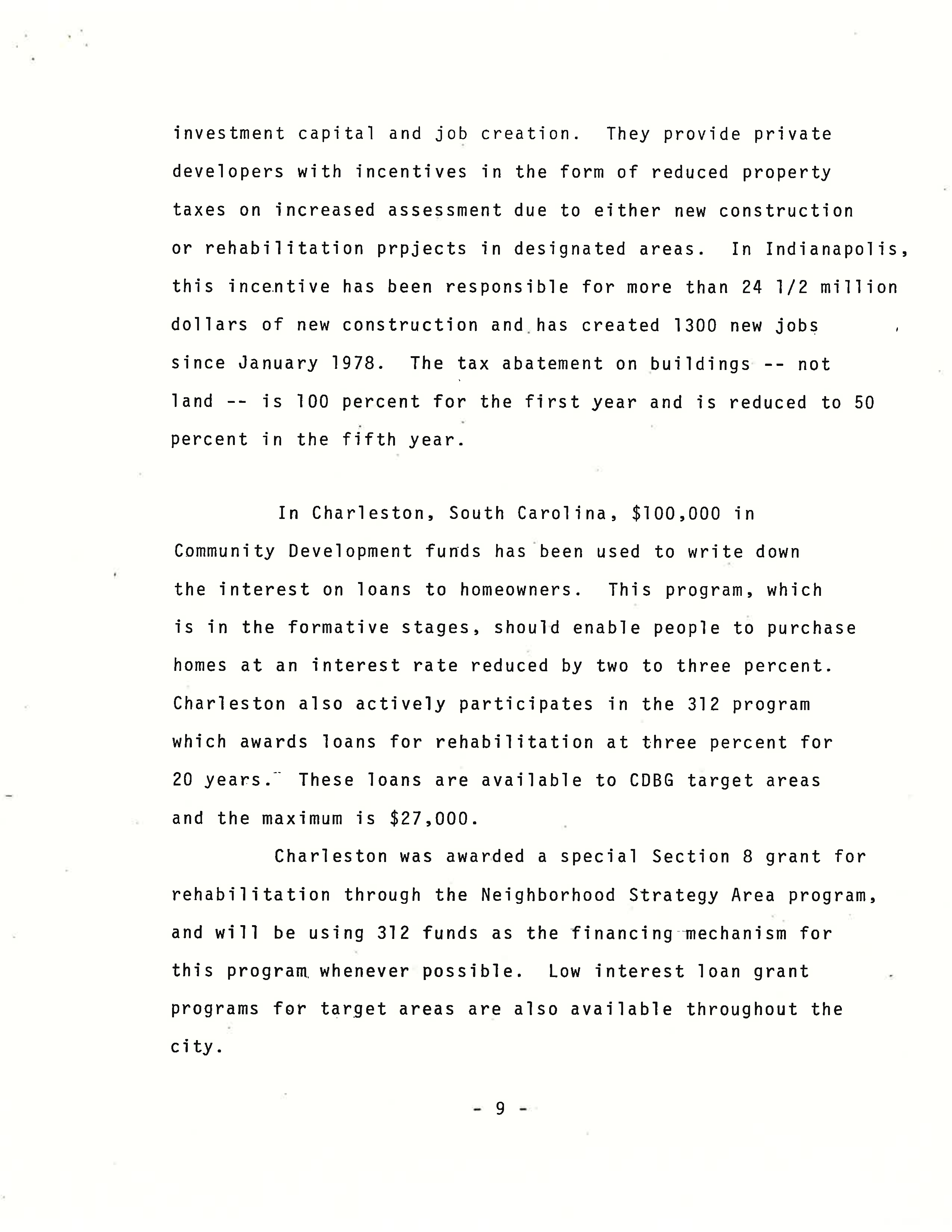 In Charleston, South Carolina, $100,000 in Community Development funds has been used to write down the interest on loans to homeowners. This program, which is in the formative stages, should enable people to purchase homes at an interest rate reduced by two to three percent. Charleston also actively participates in the 312 program which awards loans for rehabilitation at three percent for 20 years. These loans are available to CDBG target areas and the maximum is $27,000.