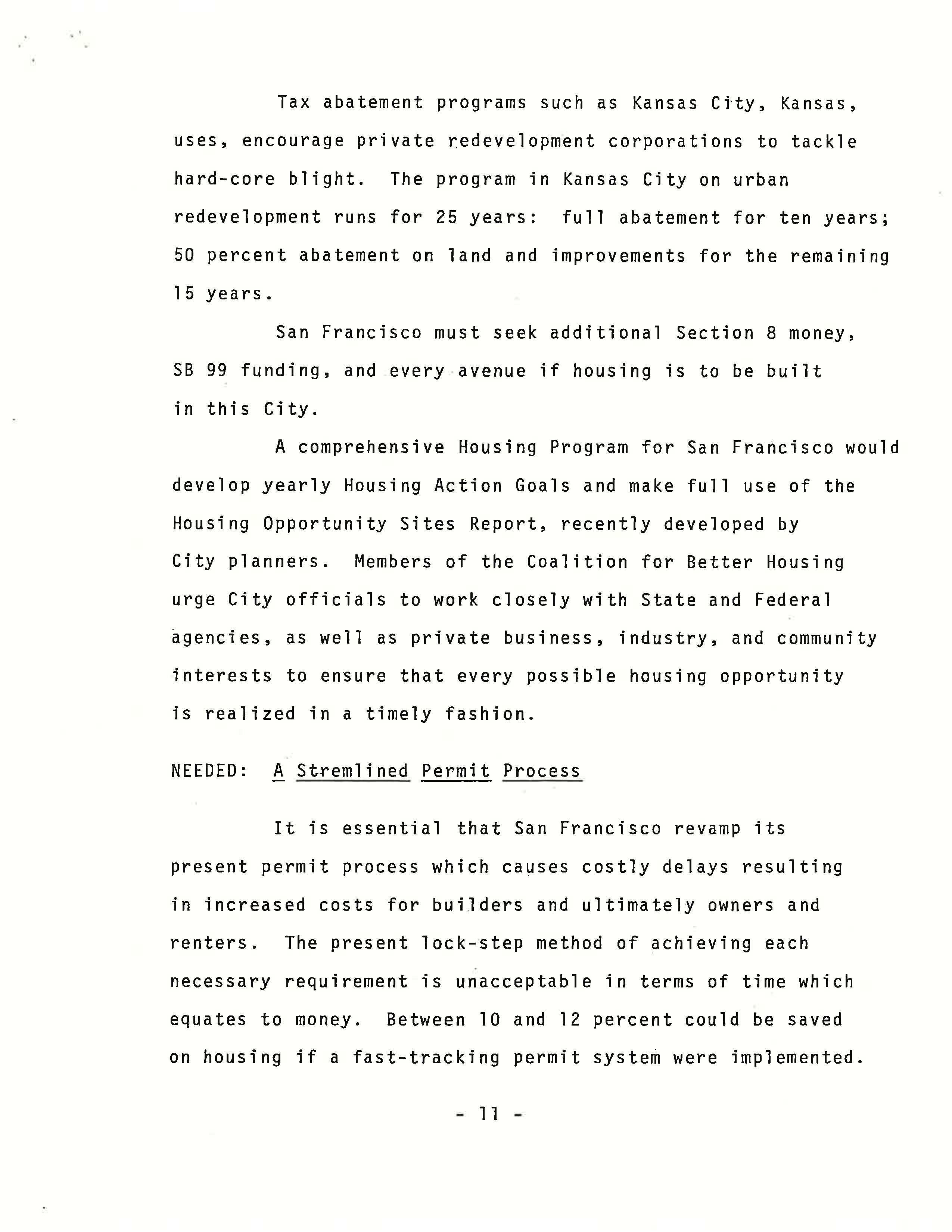 It is essential that San Francisco revamp its present permit process which causes costly delays resulting in increased costs for builders and ultimately owners and renters. The present lock-step method of achieving each necessary requirement is unacceptable in terms of time which equates to money. Between 10 and 12 percent could be saved on housing if a fast-tracking permit system were implemented.