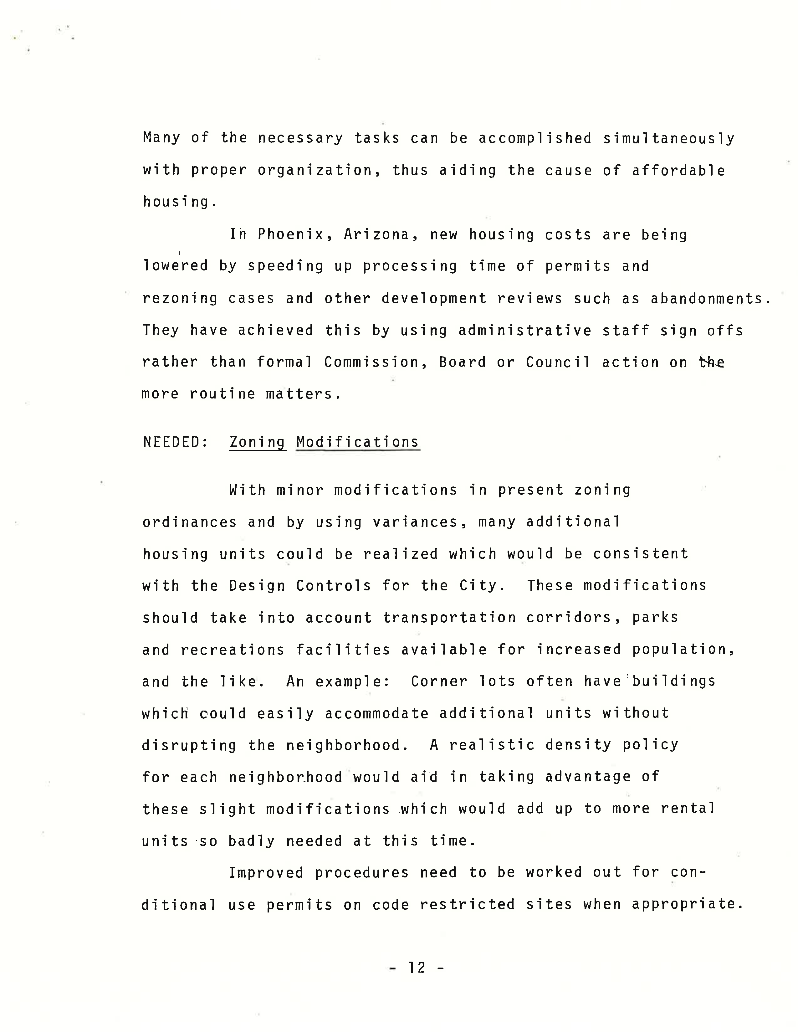 With minor modifications in present zoning ordinances and by using variances, many additional housing units could be realized which would be consistent with the Design Controls for the City. These modifications should take into account transportation corridors, parks and recreations facilities available for increased population, and the like. An example: Corner lots often have buildings which could easily accommodate additional units without disrupting the neighborhood. A realistic density policy for each neighborhood would aid in taking advantage of these slight modifications which would add up to more rental units so badly needed at this time.