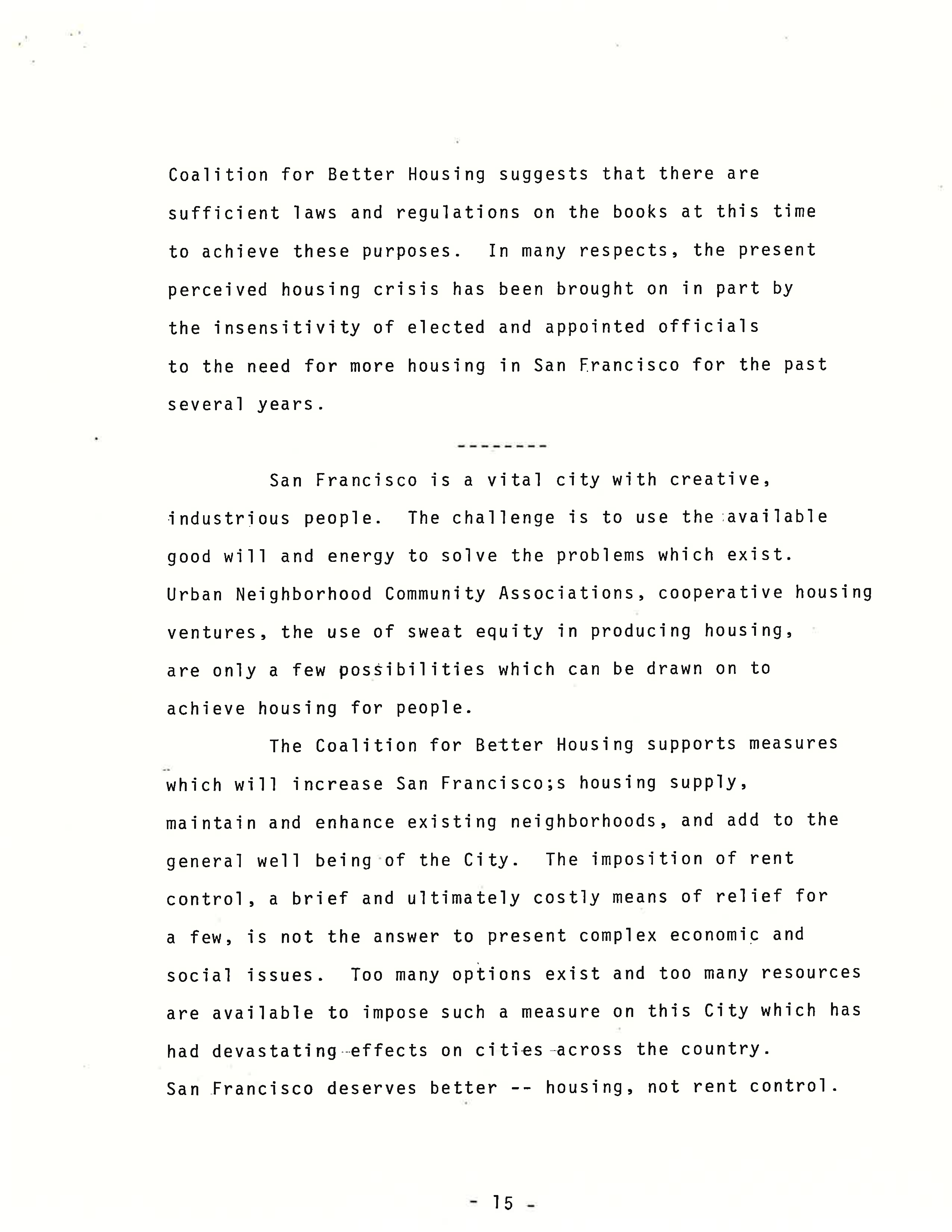 Members of the Coalition for Better Housing believe San Francisco can meet its citizens' housing needs without imposing the disastrous economic and social effects brought on by rent controls wherever ney Wceie been tried. Coalition programs include: