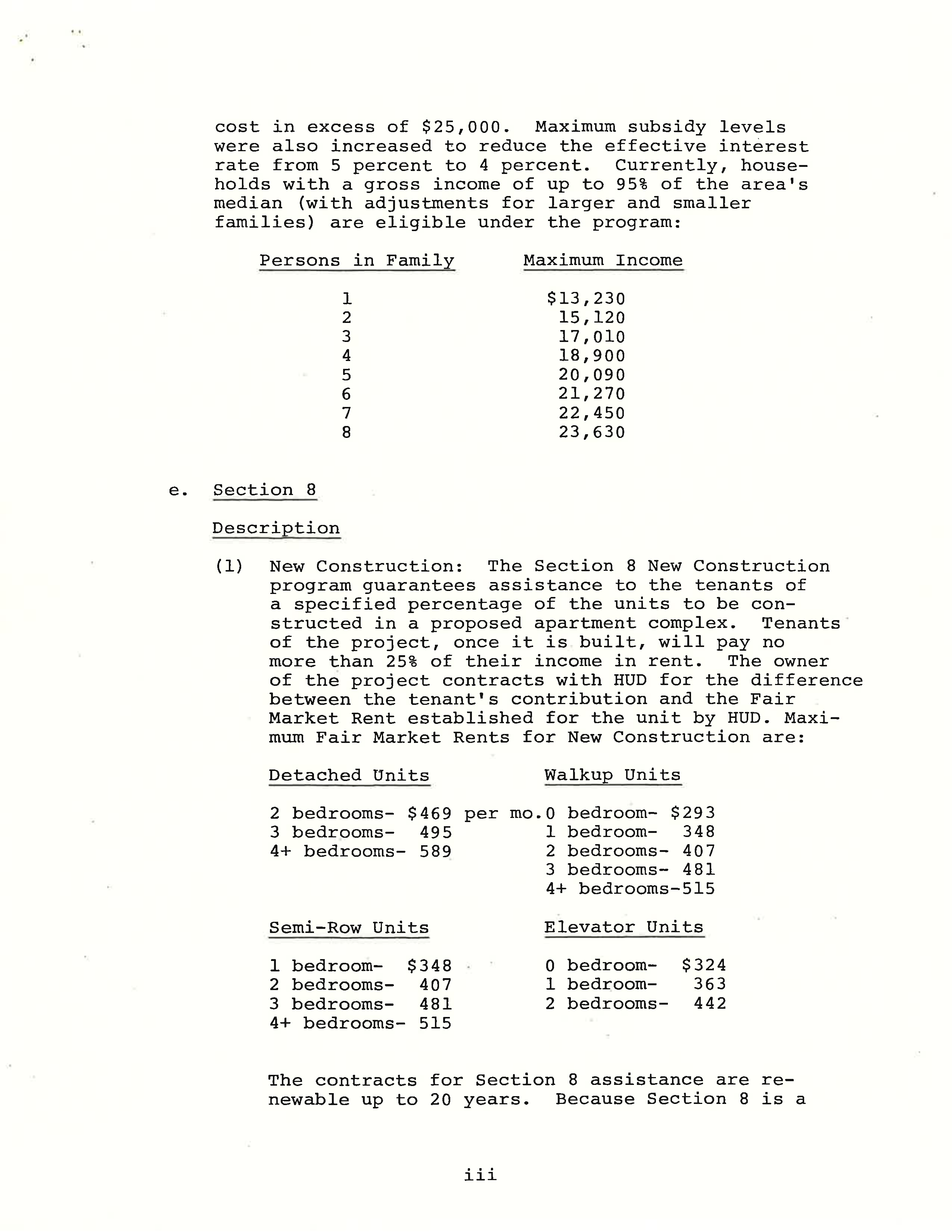 (3) Substantial Rehabilitation: The Section 8 Substantial Rehabilitation program is technically available, but has not been used yet in San Jose other than in connection with resales of HUD foreclosed apartment projects. An owner of a unit needing substantial rehabilitation could contract directly with HUD to probide assistance on behalf of a qualified tenant, effective upon the rehabilitation of the unit. Maximum Fair Market Rents are the same as for Section 8 New Construction.