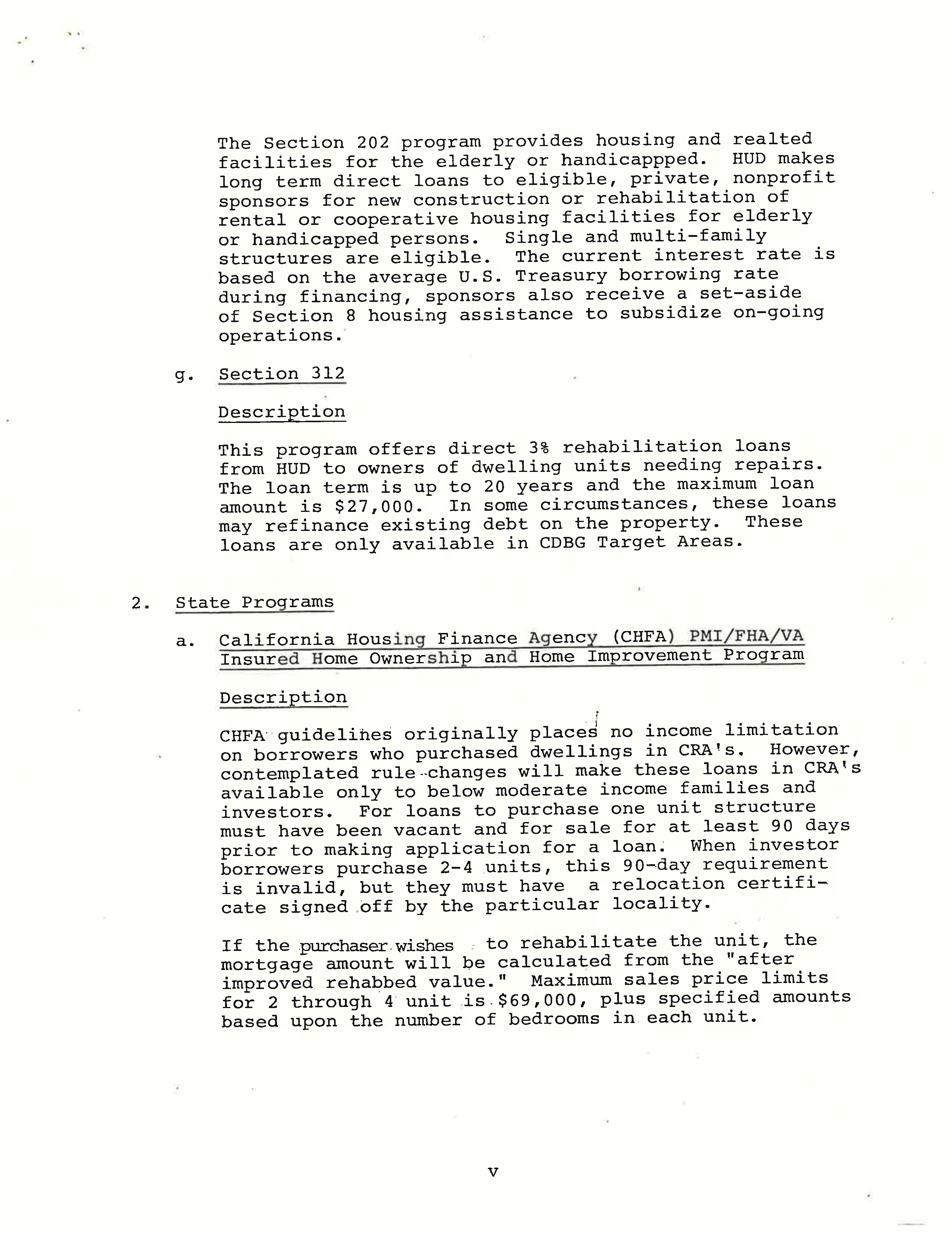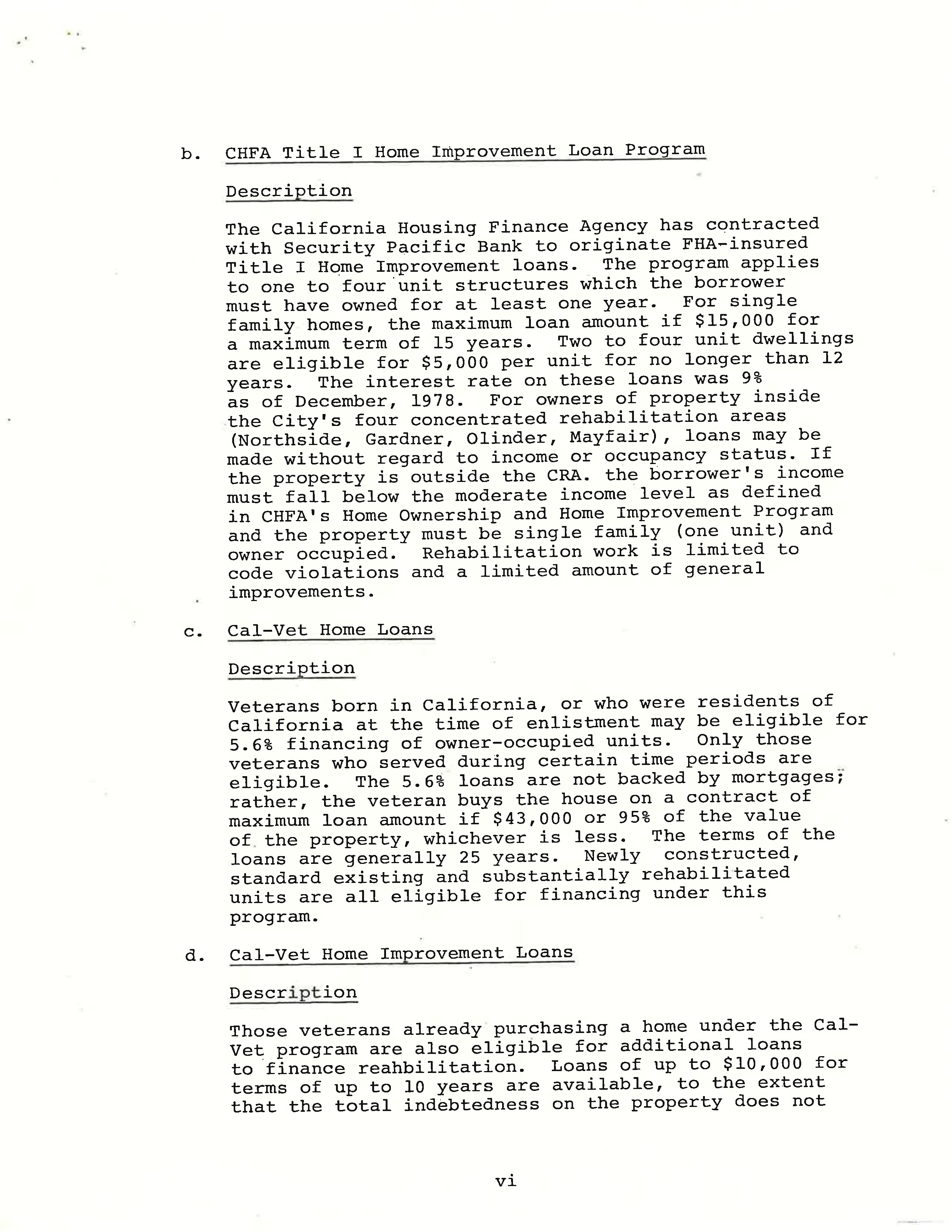 The California Housing Finance Agency has contracted with Security Pacific Bank to originate FHA-insured Title I Home Improvement loans. The program applies to one to four unit structures which the borrower must have owned for at least one year. For single family homes, the maximum loan amount if $15,000 for a maximum term of 15 years. Two to four unit dwellings are eligible for $5,000 per unit for no longer than 12 years. The interest rate on these loans was 9% as of December, 1978. For owners of property inside the City's four concentrated rehabilitation areas (Northside, Gardner, Olinder, Mayfair), loans may be made without regard to income or occupancy status. If the property is outside the CRA. the borrower's income must fall below the moderate income level as defined in CHFA's Home Ownership and Home Improvement Program and the property must be single family (one unit) and owner occupied. Rehabilitation work is limited to code violations and a limited amount of general improvements.